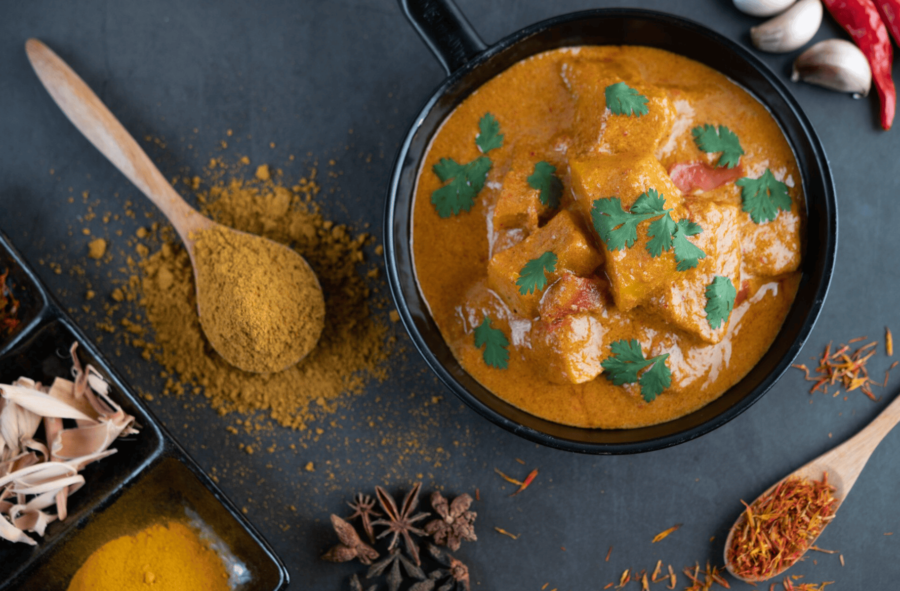 Condimentele care nu pot lipsi sunt usturoiul si ghimbirul proaspat ras, aproximativ 20g, care formeaza fundatia aromei, in timp ce garam masala, o lingurita, ofera acea nota specifica bucatariei indiene.