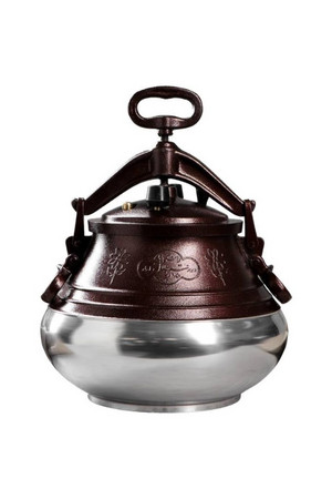 Cazanul are două mânere laterale pentru confortul tău, iar deasupra, pe pereți, sunt două bucle necesare pentru a fixa mânerul cu o clemă cu șurub, care se coboară în centru și apasă strâns capacul.
