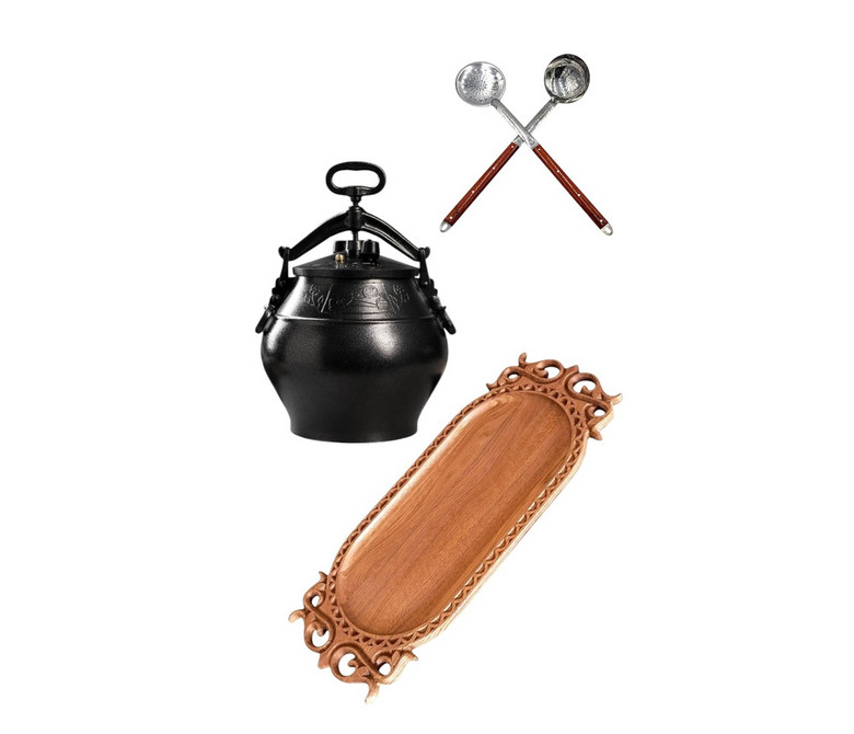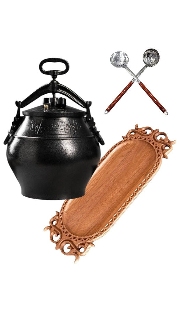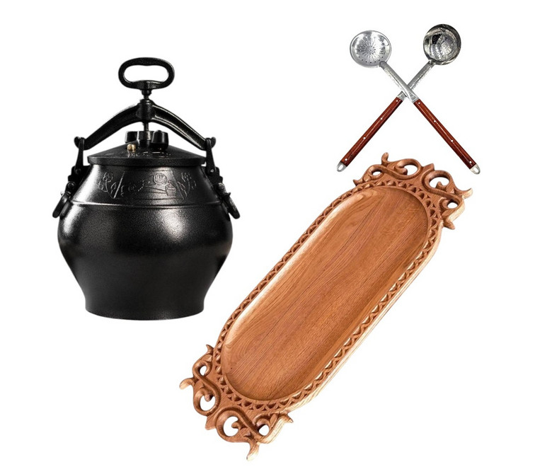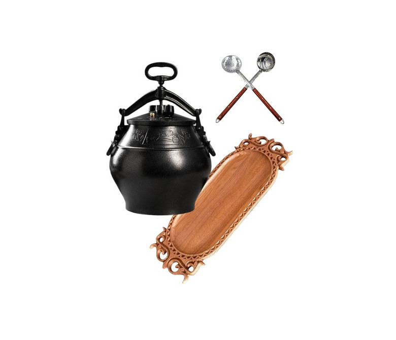 Setul complet de cazan afgan SB 30 reunește într-un singur pachet tot ce este necesar pentru gătire și servire comodă. Include cazanul afgan din aluminiu, un platou artistic din lemn și ustensile practice pentru servirea preparatelor.
